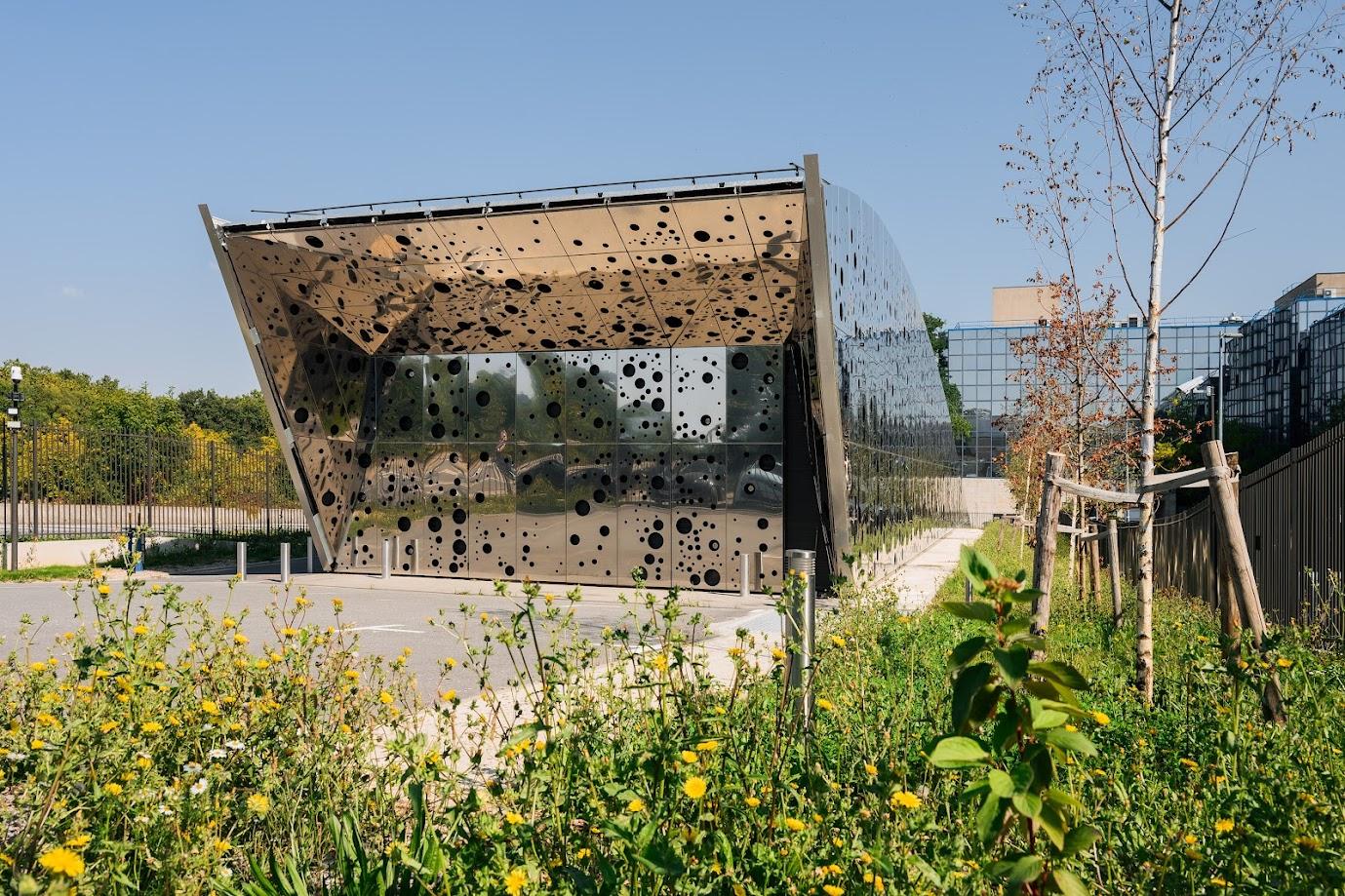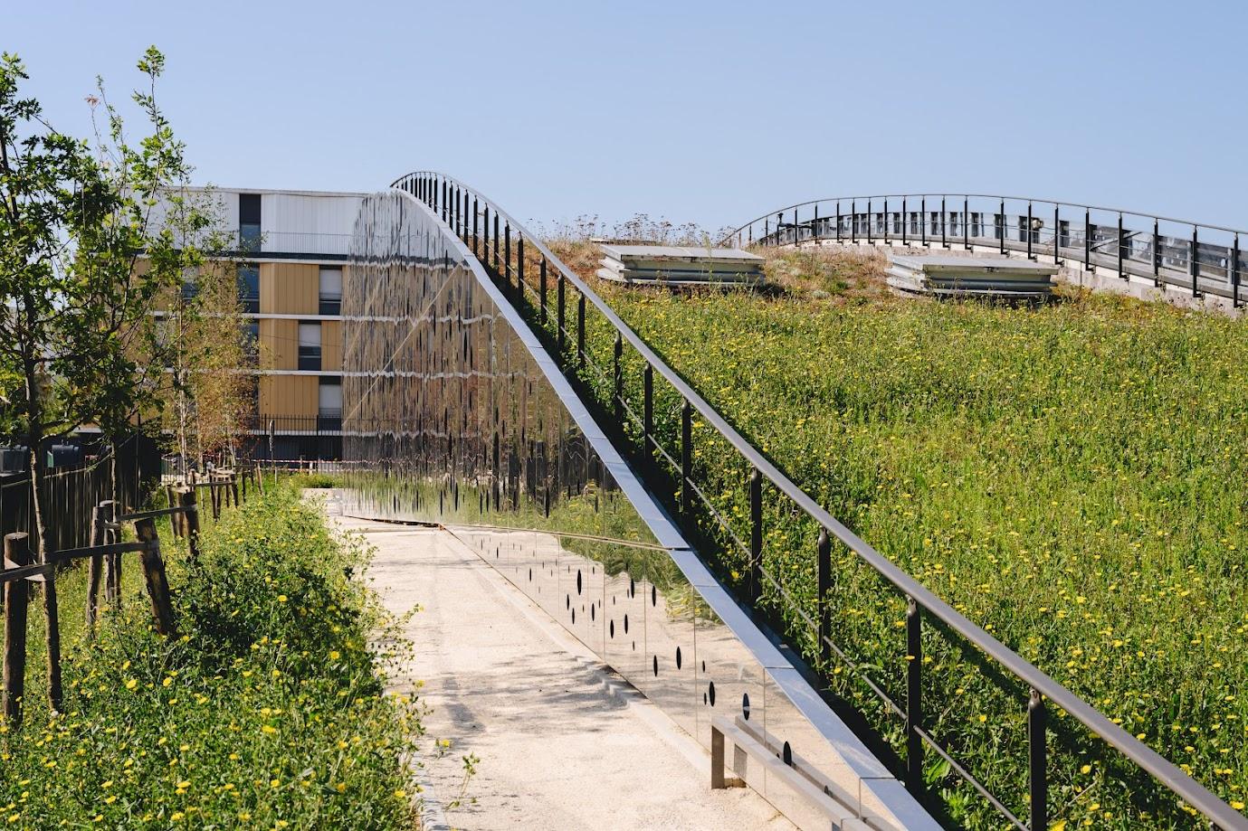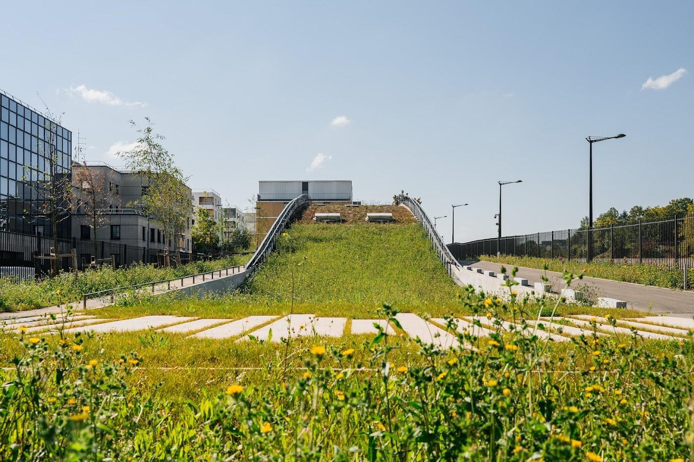 Le volume bâti apparaît comme un soulèvement du terrain, qui est couvert uniformément de végétation, tandis-que la courbure du toit de l’édifice apporte une douceur qui contraste avec la rigueur des immeubles environnants.