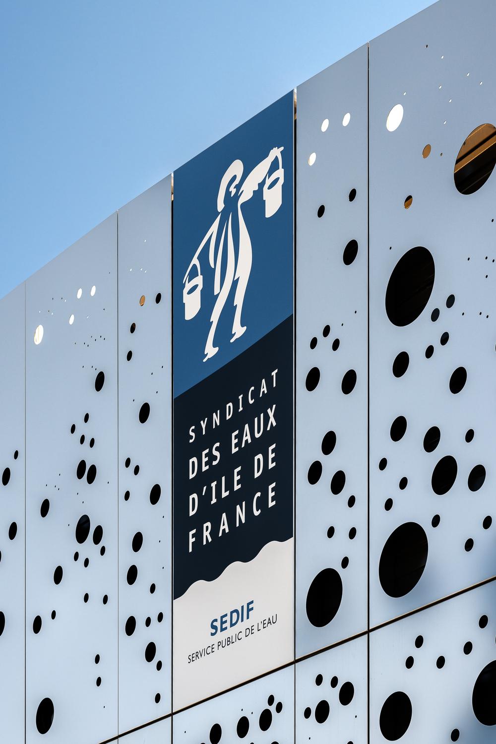 Cette enveloppe unifiante, qui rappelle la pureté de l’eau, est percée d’ouvertures circulaires, de diamètres variés afin d’évoquer le mouvement ascendant d’une multitude de bulles d’eau.