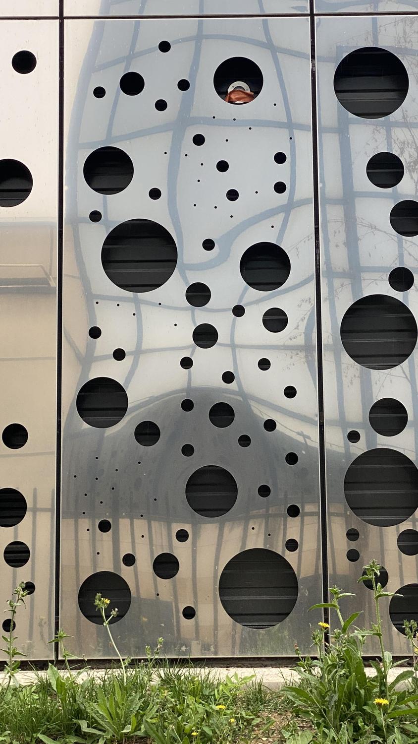 Les trois façades de l’édifice sont traitées de façon identique par un habillage en tôles d’inox poli brillant perforées.